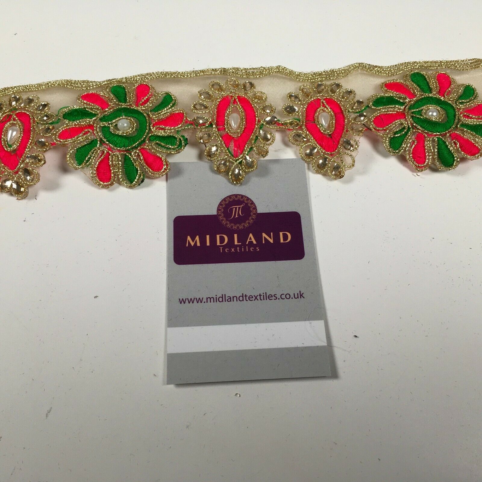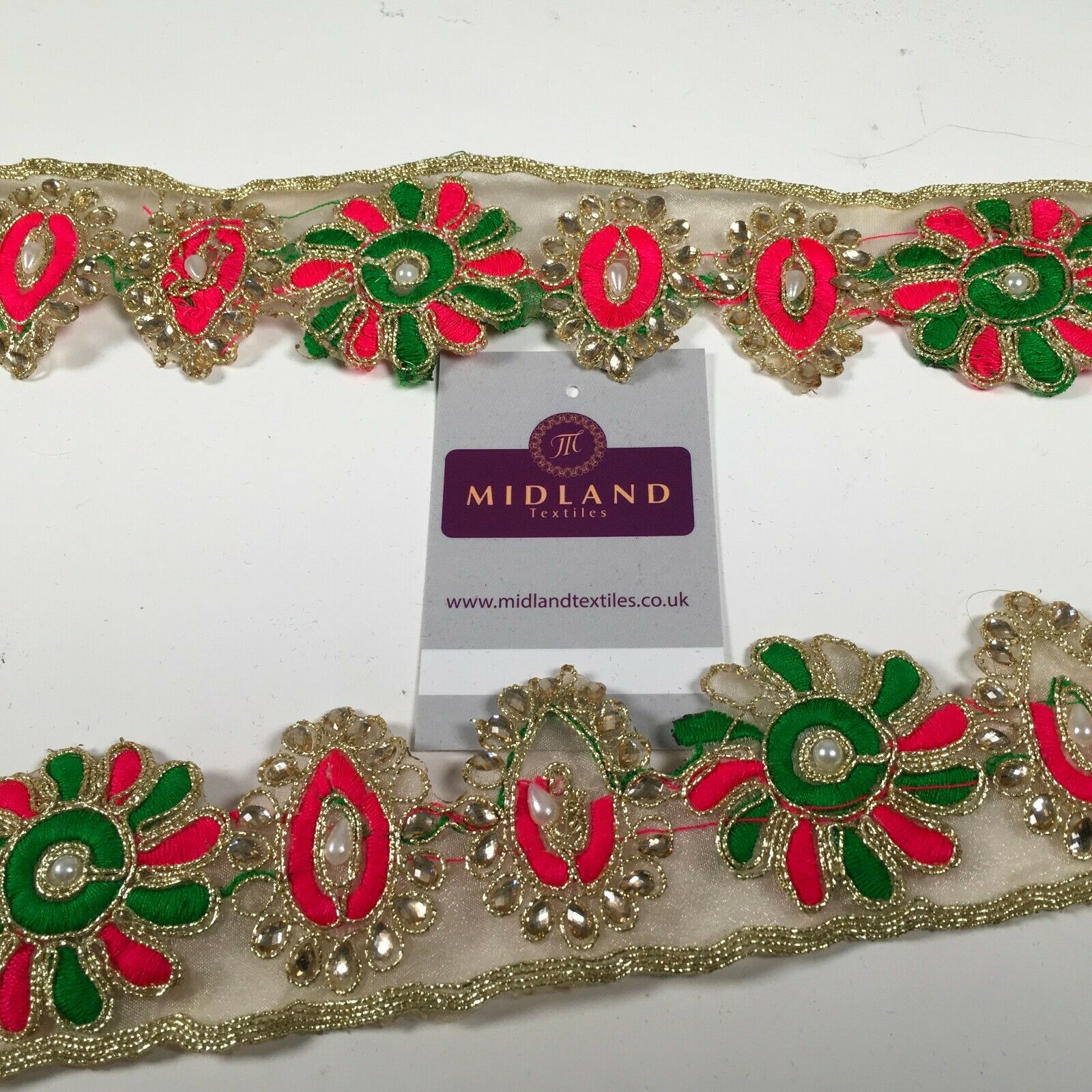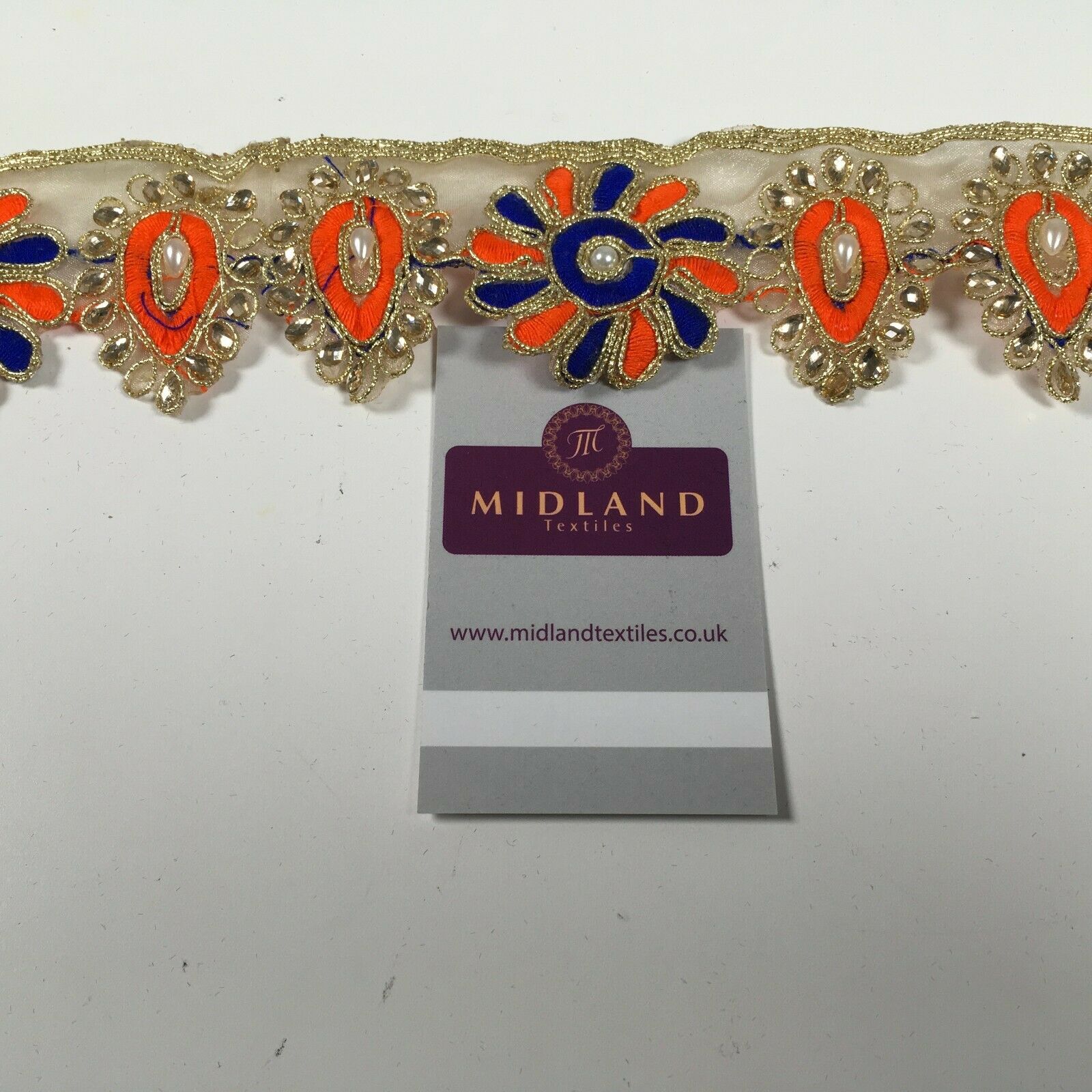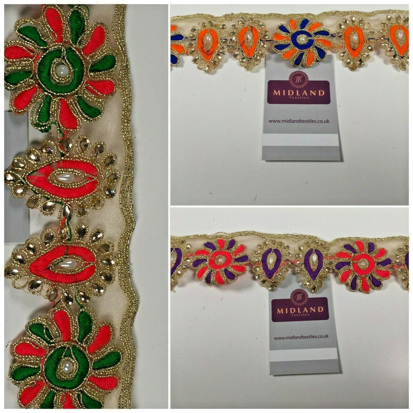 Midland Textiles LimitedItem Number M1346Description: 50mm Gold Organza Floral Embroided Pearl border saree edging M1346Width 50mmSample Size approx 5cm * 10cmRETURNS POLICY: Once cut and despatched we cannot refund fabric orders, Please order a sample to avoid disappointment.If you have received a damaged or faulty item please contact us and we will do our best to resolve the problem as quickly as possible and without any further cost to yourself.