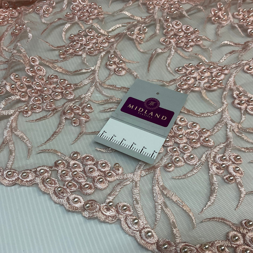 This exquisite pale pink embroidery lace with pale pink faux pearls and pale pink bungle beads - Double scalloped border Fabric is the perfect addition to any handmade project. The delicate lace is adorned with shimmering faux pearls and vibrant pale pink bugle beads, creating a truly eye-catching effect. The double-scalloped border adds a touch of elegance and sophistication, making this fabric perfect for bridal gowns, evening wear, and more.