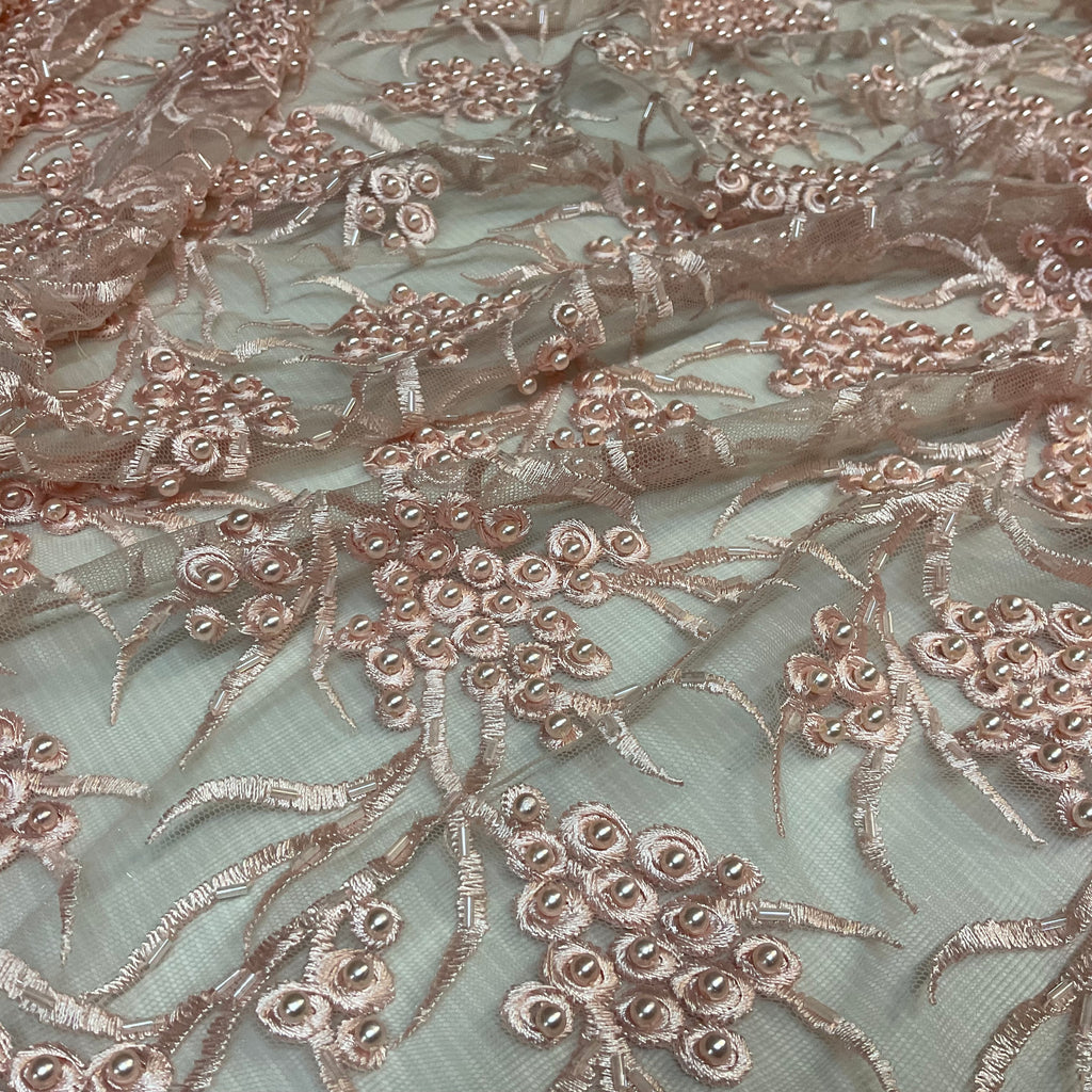 This stunning pale pink embroidery lace with pale pink faux pearls and pale pink bungle beads - Double-scalloped border Fabric can be used for a variety of handmade projects, including: