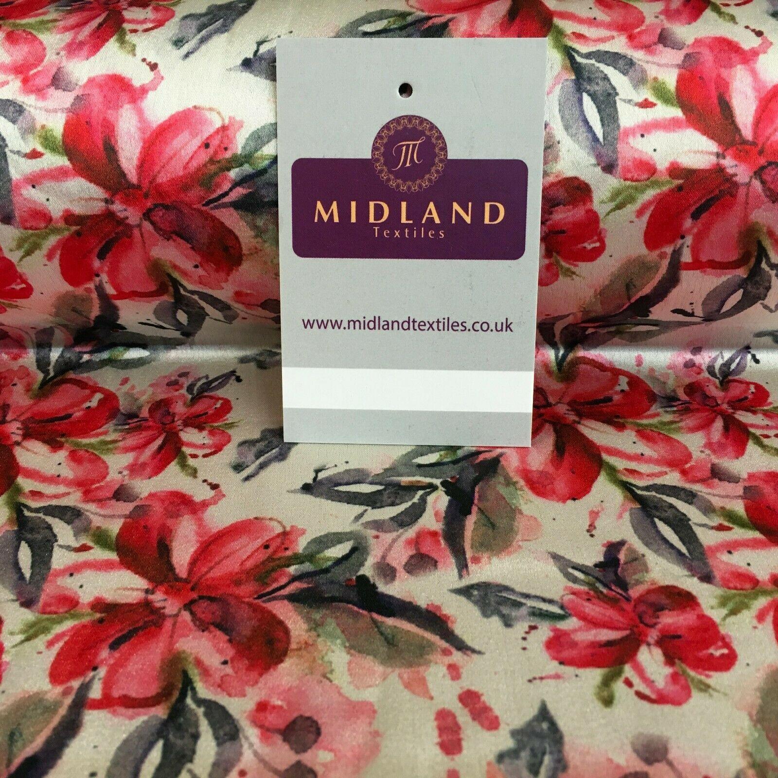 Midland Textiles LimitedItem Number MK1327-1Description: Cream Pink Floral Silky Satin Georgette Digital Printed Fabric 150cm MK1327-11 Colour: Width  150 cmSample Size approx 10cm * 10cmWashing Instructions: HandwashRETURNS POLICY: Once cut and despatched we cannot refund fabric orders, Please order a sample to avoid disappointment.If you have received a damaged or faulty item please contact us and we will do our best to resolve the problem as quickly as possible and without any further cost to yourself.