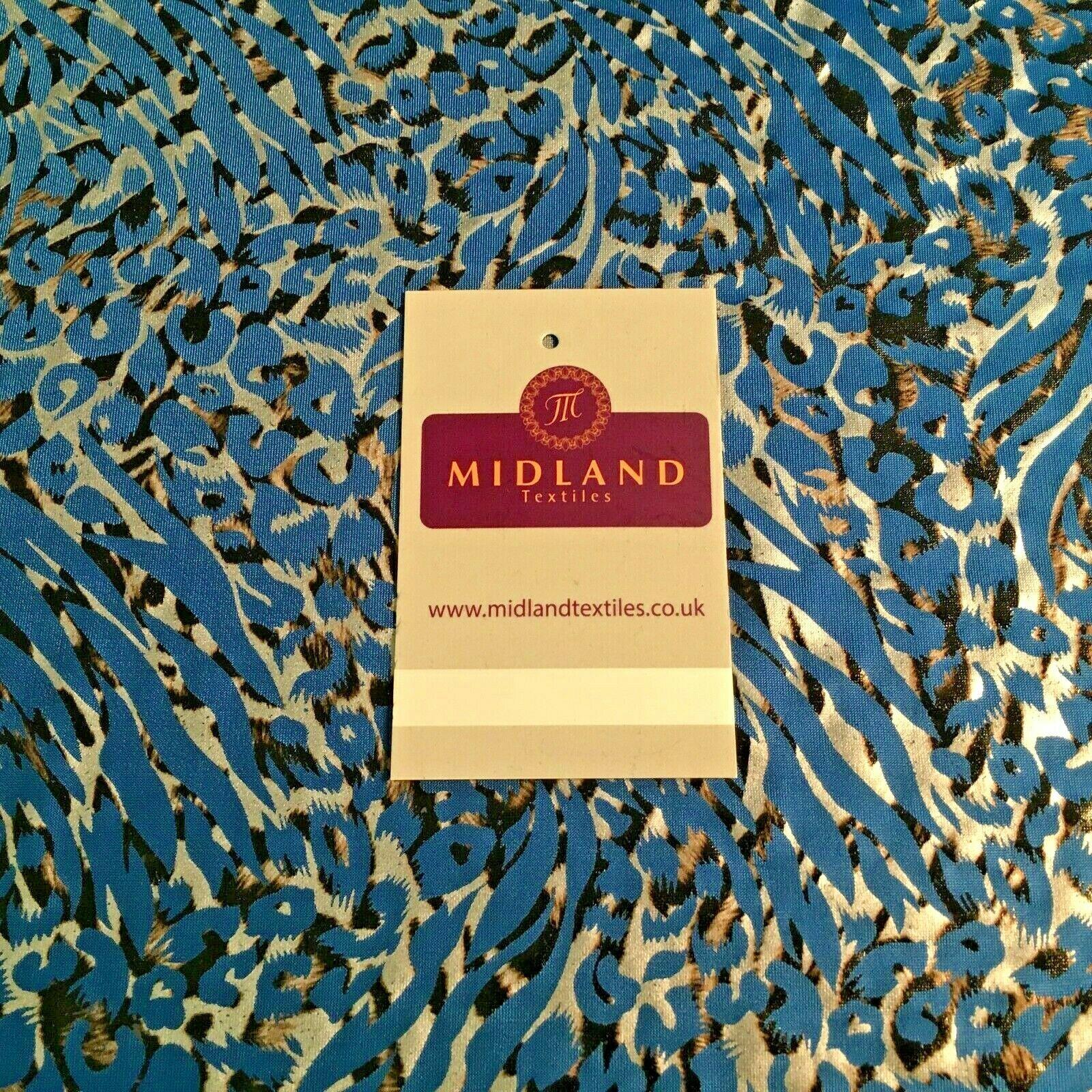 Midland Textiles LimitedItem Number MU1272Description: Blue Black Silver Animal Spandex Jersey Foil Stretch Dress Fabric 150cm MU1272Width 150 cmSample Size approx 10cm * 10cmWashing Instructions: HandwashRETURNS POLICY: Once cut and despatched we cannot refund fabric orders, Please order a sample to avoid disappointment.If you have received a damaged or faulty item please contact us and we will do our best to resolve the problem as quickly as possible and without any further cost to yourself.