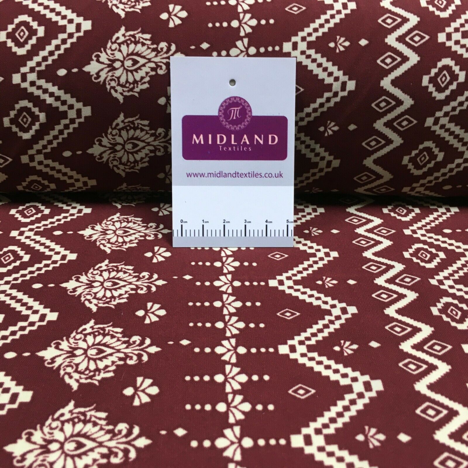 Description: Brown Rust geometric peach crepe Fabric M1400-10 Mtex