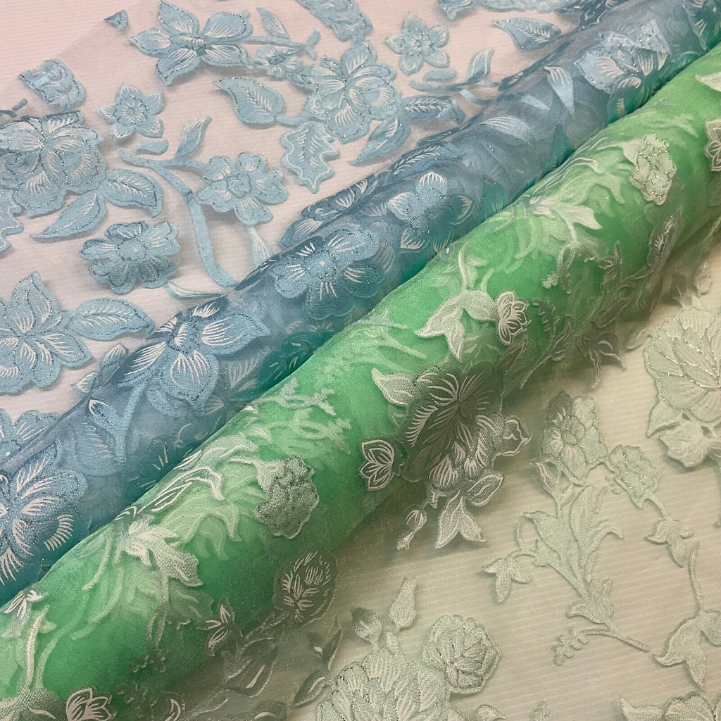 This stunning organza fabric features a delicate floral pattern, beautifully accented with a silver lacquer finish. Its sheer, lightweight quality makes it perfect for creating a variety of elegant garments, including: