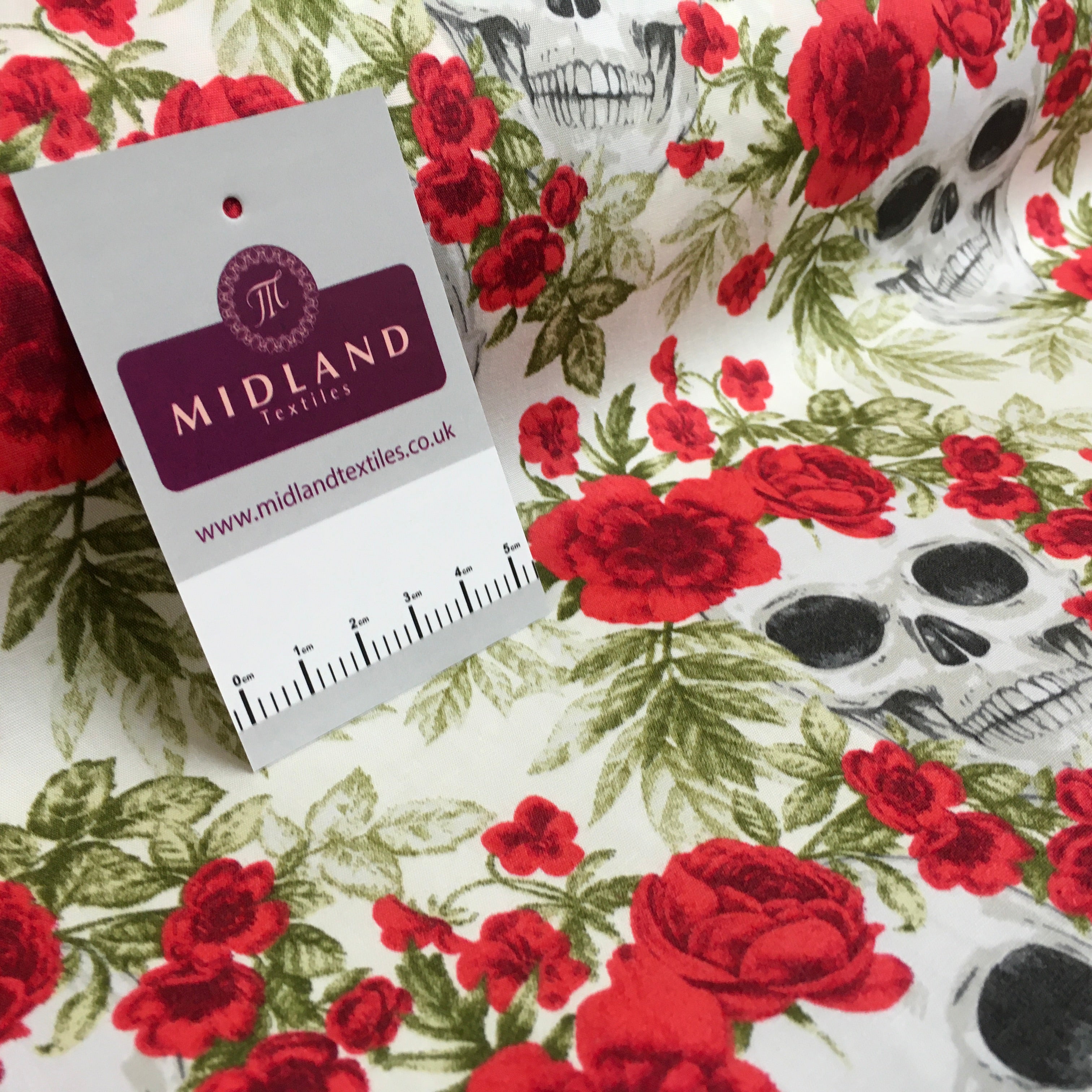 Midland Textiles LimitedItem Number MD1395Description: Skull and roses printed 100% cotton poplin craft Fabric 110 cm MD1395 Mtex2 Colours: Width 110 cmWashing Instructions: Manufacturer says: 40 degree machine wash. Medium tumble-dry. We strongly recommend testing a small piece first to be sure.RETURNS POLICY: Once cut and dispatched we cannot refund fabric orders, Please order a sample to avoid disappointment.If you have received a damaged or faulty item please contact us and we will do our best to resolve the problem as quickly as possible and without any further cost to yourself.